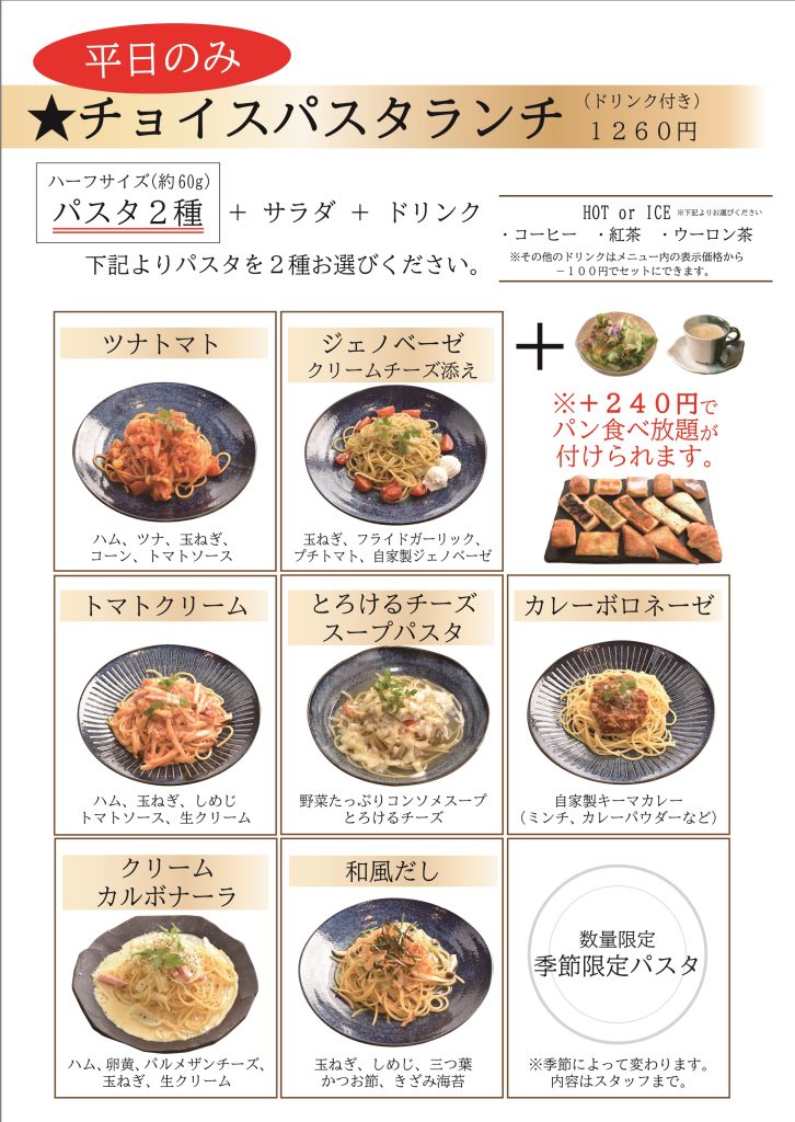 ※パンの種類は指定できかねます。また中学生以上の方はランチのご注文をお願いします。小学生のお子様は席代・パン代として200円でパンのおかわりがご利用できます。